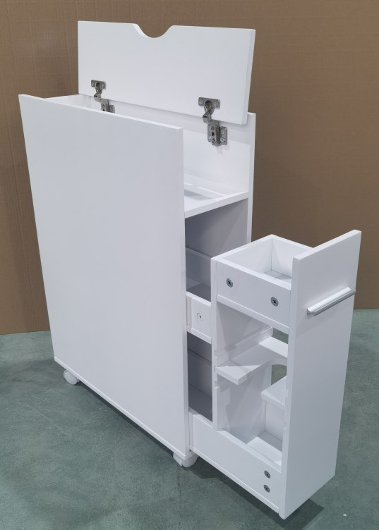 » Der Toilettenschrank überzeugt mit seinem schmalen Design und dem ausziehbaren Fach. Perfekt für kleine Bäder, bietet er genügend Stauraum für alle wichtigen Utensilien.