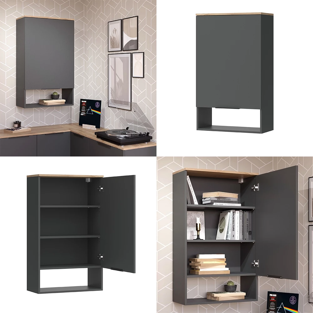 - Der Hängeschrank mit Tür bietet geschlossene Fächer und ein Regal für reichlich Stauraum.