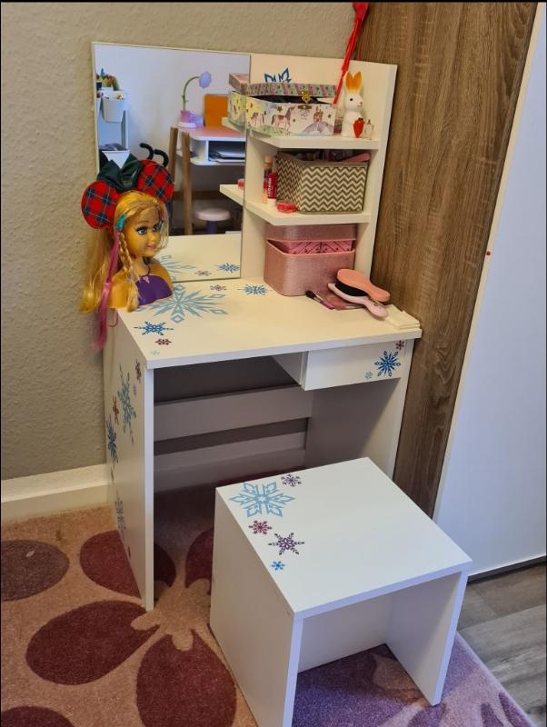» Als Eiskönigin Fan passt der Schminktisch sehr gut ins Zimmer aufgrund des Schneeflocken Design und wie man sieht der Tisch wird für alles genutzt. Sehr schöner Tisch, meine Kleine liebt ihn.