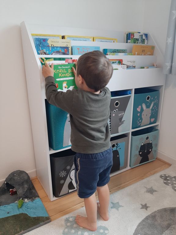 » Wir sind sehr zufrieden mit dem Regal. Es gibt Platz für viele Bücher, und auch Spiele und Puzzles haben ihren Platz im Regal gefunden. Unser 3-jähriger Sohn kann alle Bücher selbst herausnehmen, daher ist auch die Höhe gut. In den Kisten am Boden ist Platz für jede Menge Spielzeug. Das macht das Aufräumen viel einfacher und die Boxen sehen sehr schön aus.