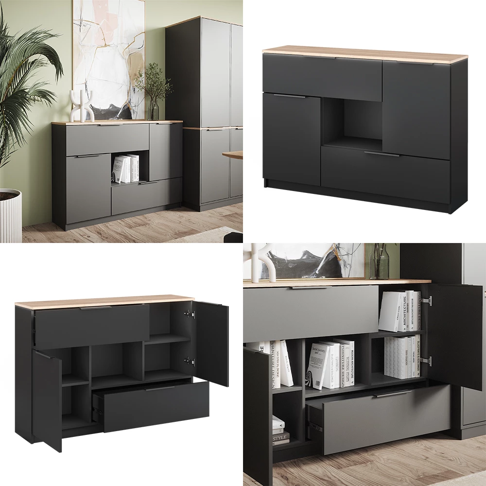 Die Kommode Betti ist eine gute Entscheidung für jede Wohnung. Ihr stilvolles Aussehen macht sie zu einem universellen Möbelstück, das einfach zu bedienen und unterhaltsam ist.Der Kommodenschrank bietet viel Stauraum bei modernem und zeitlosem Design. Er verfügt über 4 Schubladen.MAßE: Die Kommode mit Schubladen hat folgende Abmessungen: Breite: 80 cm, Höhe: 101.9 cm, Tiefe: 48 cm. Alle detaillierten Größen sind auf den Fotos angegeben.MATERIAL: Das Sideboard besteht aus pflegeleichter, melaminharzbeschichteter 16 mm SpanplatteLIEFERUMFANG: Sideboard, Montageanleitung, MontagematerialDie Kommode Betti bietet nicht nur praktischen Stauraum, sondern auch ein funktionelles und zeitloses Design für Ihr Schlafzimmer. Mit ihren 4 geräumigen Schubladen können Sie all Ihre Kleidung und Accessoires ordentlich verstauen und haben alles schnell zur Hand. Dank des modernen Aussehens der Kommode lässt sie sich zudem wunderbar mit anderen Möbelstücken kombinieren und gibt Ihrem Zuhause einen frischen Look. Mit der Kommode Betti können Sie Ihren vier Wänden nicht nur mehr Ordnung, sondern auch mehr Stil verleihen. Holen Sie sich jetzt dieses praktische Möbelstück und bringen Sie mehr Ordnung in Ihr Schlafzimmer!---Technische Details:Farben:Korpus: AnthrazitOberseite: SonomaMaße:80 x 101,9 x 48 cm (BxHxT)Material:Korpus: Spanplatte, 16 mm, melaminharzbeschichtetOberfläche:MelaminharzbeschichtungArtikelgewicht:44.06 kgArtikelgewicht inkl. Verpackung:46.04 kg---LIEFERUMFANG: Kommode mit Schubladen, Montageanleitung, Montagematerial.Die Möbelserie "Betti" bietet eine vielfältige Auswahl an stilvollen Möbelstücken, darunter Nachttische, Schränke und Kommoden. Mit ihrem zeitgemäßen Design und hochwertigen Materialien sind die Möbel von "Betti" eine elegante Ergänzung für Ihr Schlafzimmer und bieten praktischen Stauraum und Funktionalität.