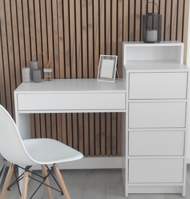Die Frisierkommode ohne Spiegel Naara ist eine gute Entscheidung für jedes Zuhause. Mit ihrem stilvollen Aussehen passt sie perfekt in jedes Interieur.Der kosmetische Tisch verfügt über ein offenes Fach, 5 Schubladen und eine breite Arbeitsplatte für ausreichend Platz zum Schminken und Stylen.MAßE: Der Frisiertisch hat folgende Abmessungen: Breite: 110,5 cm, Höhe: 100,6 cm, Tiefe: 40,3 cm. Alle detaillierten Größen sind auf den Fotos angegeben.MATERIAL: Der Kosmetiktisch besteht aus pflegeleichter Spanplatte 16 mm, mit einer MelaminharzbeschichtungLIEFERUMFANG: Schminktisch, Hocker, Montageanleitung, MontagematerialDie schlichte Optik und das moderne Design des Naara-Schminktisches bringen Eleganz in jeden Raum. Die Kombination aus geschlossenem und offenem Stauraum bietet reichlich Platz und ermöglicht eine ansprechende Präsentation von Lieblingsstücken. Die Schubladen mit Push-to-open-Funktion bieten Komfort und Leichtigkeit bei der Benutzung. Als Teil der Naara-Möbelserie fügt sich der Schminktisch perfekt in ein stimmiges Raumkonzept ein.Dieses Angebot umfasst ebenfalls folgende Produkte:Ein Hocker, der speziell für unsere Schminktische entworfen wurde, mit verstellbarer Höhe für mehr Vielseitigkeit. Er bietet eine bequeme Sitzgelegenheit, ergänzt perfekt den Ankleidebereich und passt sich an unterschiedliche Tagesabläufe an.---Technische Details:Farbe:WeißAbmessungen:110.5 x 100.6 x 40.3 cm (BxHxT)Material:Spanplatte, 16 mmOberfläche:MelaminharzbeschichtungArtikelgewicht:43.15 kgArtikelgewicht inkl. Verpackung:47.6 kg---LIEFERUMFANG: Schminktisch, Hocker, Montageanleitung, Montagematerial.Die Möbelserie "Naara" bietet stilvolle und funktionale Möbelstücke für Schlafzimmer und Ankleidezimmer, darunter Nachttische, Kommoden, Schminktische und Kleiderschränke. Entdecken Sie vielfältige Möglichkeiten, um Ihren Raum individuell zu gestalten.