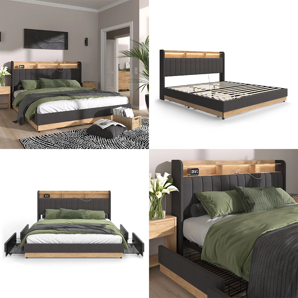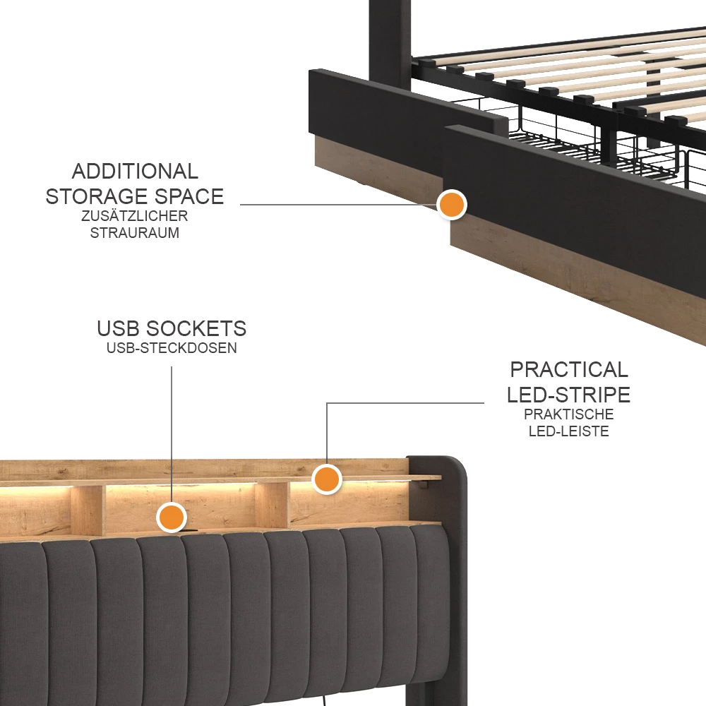 - LIEFERUMFANG: 1x Bett, 1x USB Steckdose. 1x LED Streifen, 1x Fernbedienung , 4x Schubladen mit Metallgitter (Dekoration nicht enthalten)