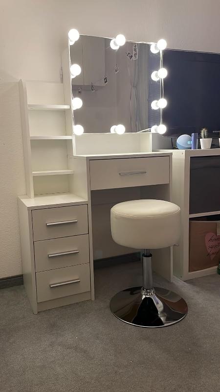» Der Schminktisch sieht echt gut aus und erfüllt seinen Zweck. Die LED-Beleuchtung sorgt für eine angenehme Stimmung beim Stylen. Mit genug Stauraum für meine Sachen ist er auch ziemlich praktisch. Der Hocker ist bequem, aber ich hätte mir vielleicht eine etwas stabilere Konstruktion gewünscht. Insgesamt ein gutes Produkt für den Preis – da kann man nicht viel falsch machen!