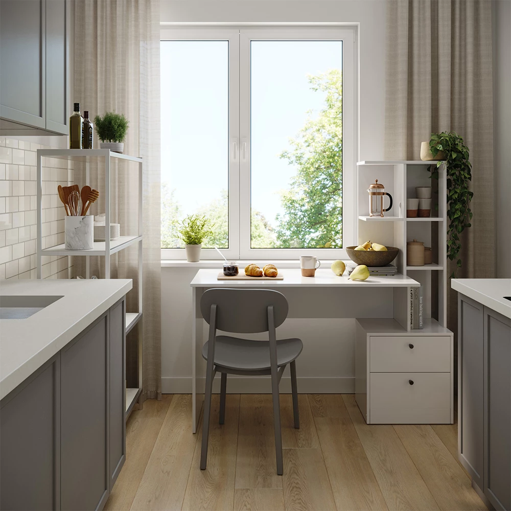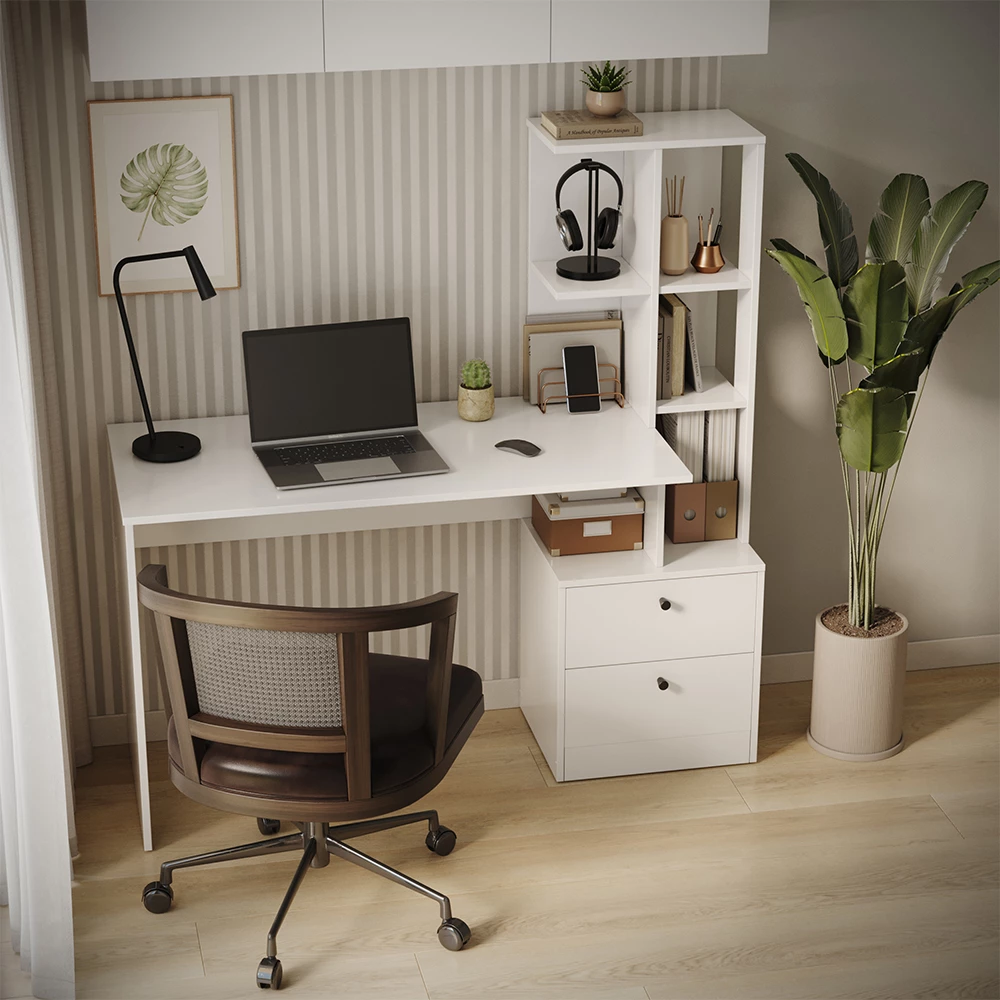 - Der Arbeitstisch für das Büro verfügt über zwei Schubladen und offene Regale für reichlich Stauraum. Ideal für ein aufgeräumtes Arbeitsumfeld.