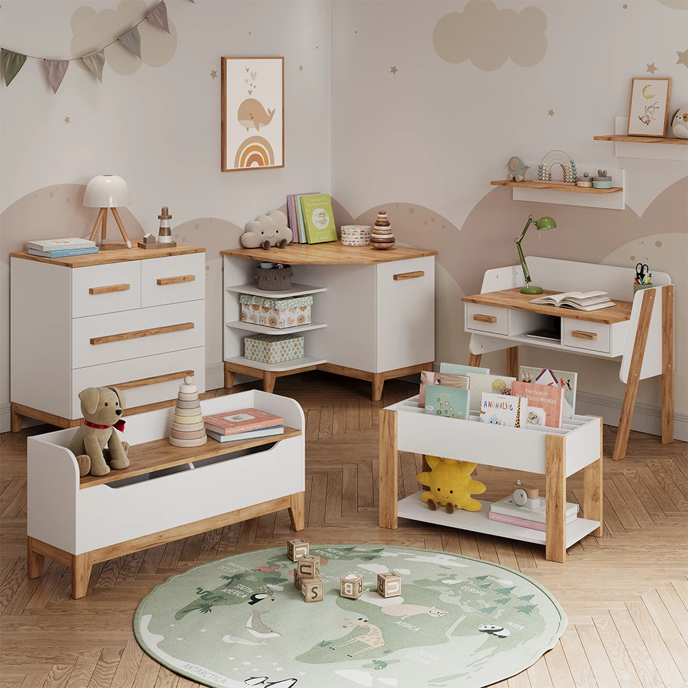 - Der Schrank für Kinderkleidung bietet vier Einlegeböden, eine praktische Kleiderstange und eine geräumige Schublade, um die Kleidung Ihres Kindes optimal zu organisieren.
